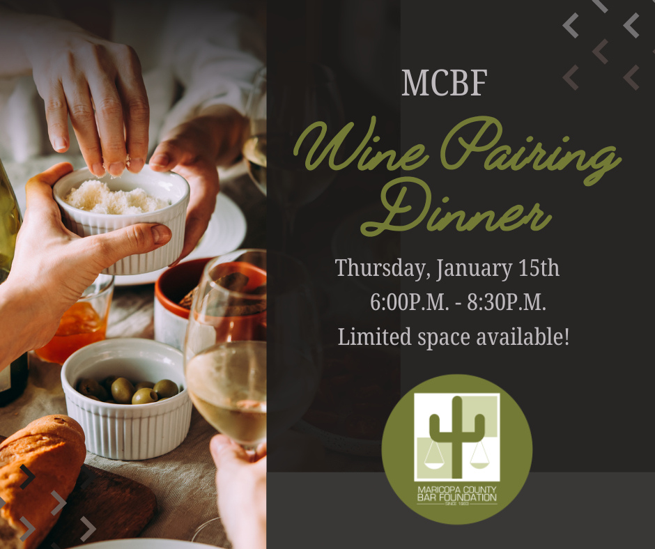 All proceeds from the dinner will benefit the Maricopa County Bar Foundation and its impactful programs. Enjoy an evening of great food and meaningful giving, with a brief presentation showcasing the Foundation’s philanthropic efforts and the lives it touches.