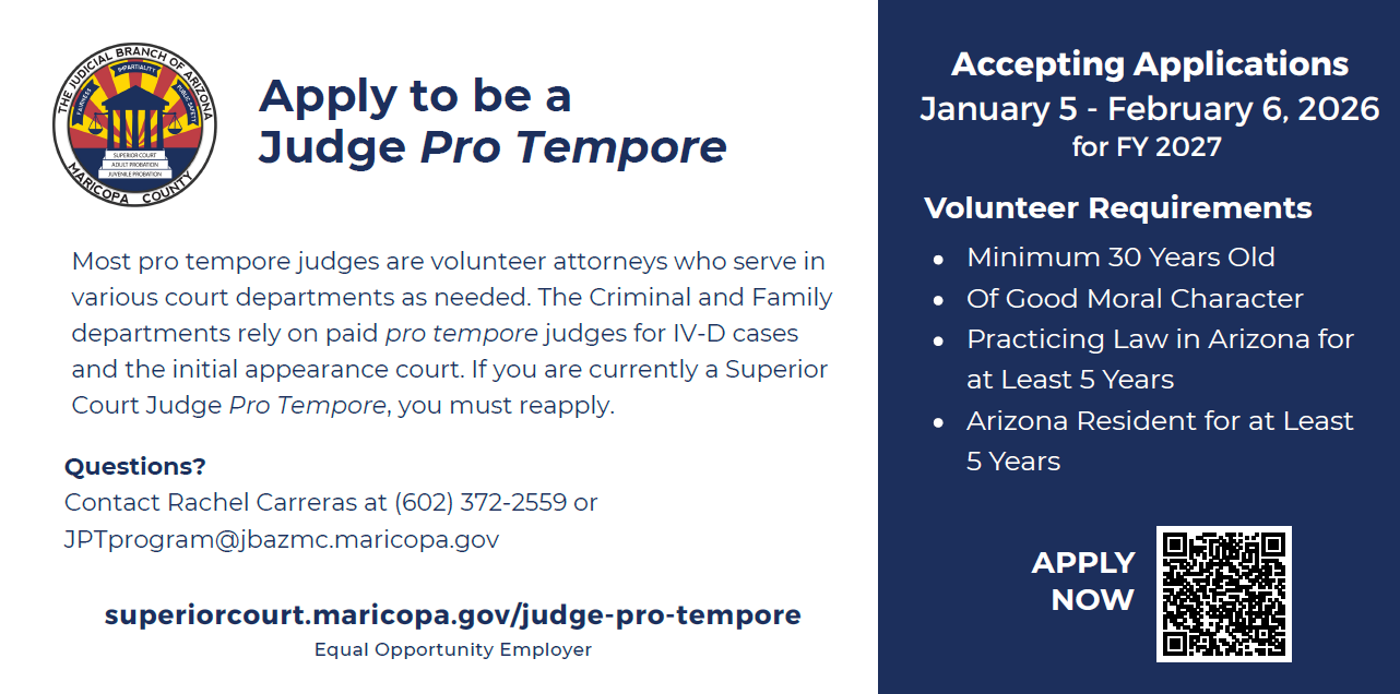 Applicants must be at least 30 years of age, of good moral character, admitted to the practice of law in, and a resident of Arizona for the past five years, and a resident of Maricopa County for the past year.